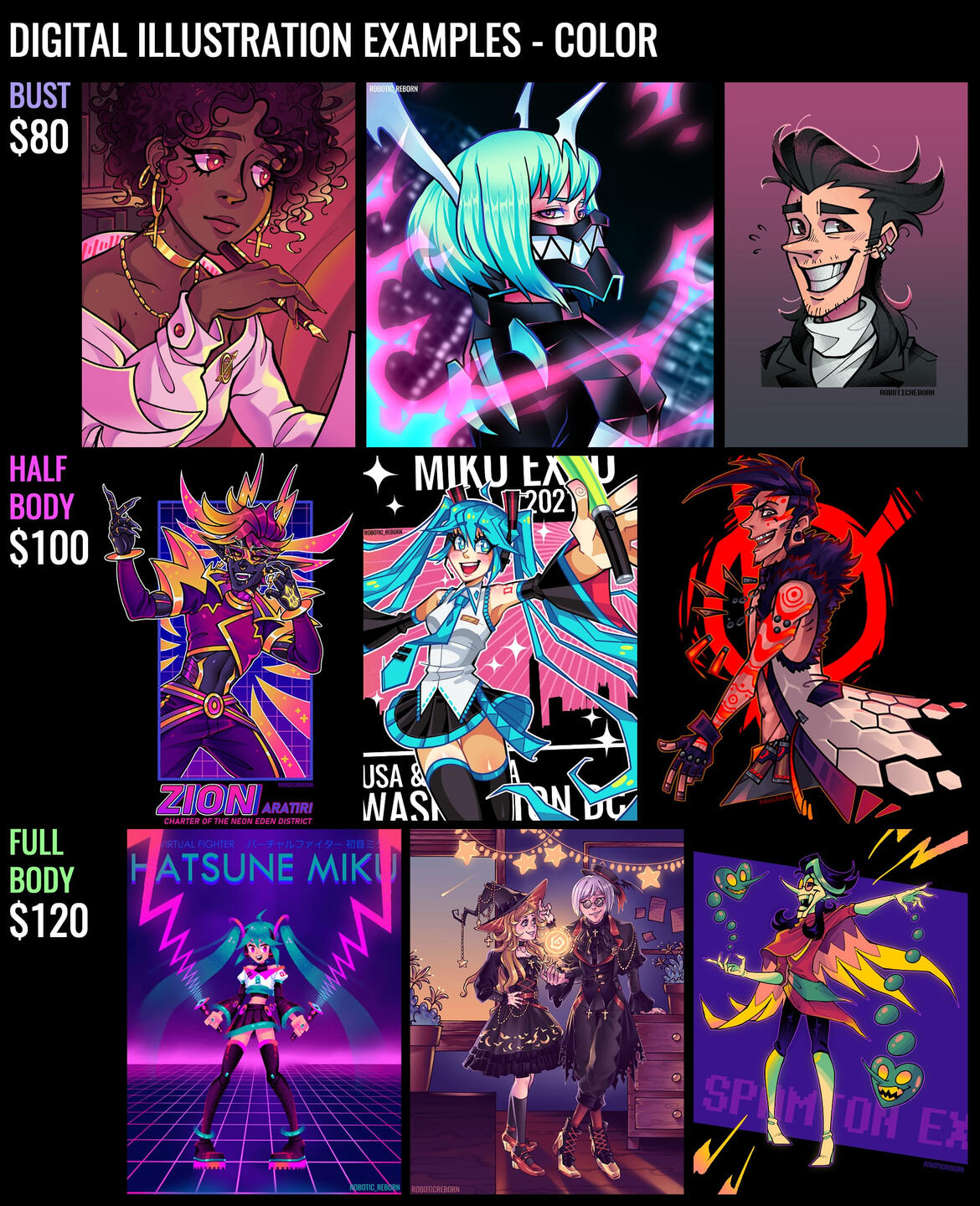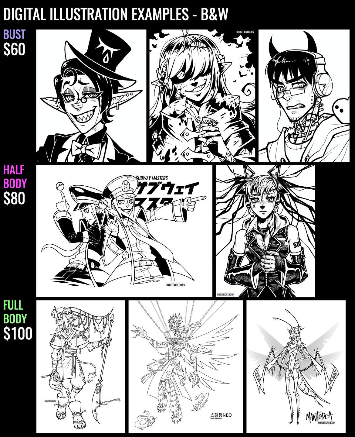 -Complex environments cost an extra $10 for B&W illustrations, and $20 for Color illustrations.Prices may vary slightly by character complexity.